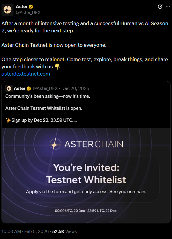 Der CEO von Aster sagt, dass die vollständige Offenheit des Testnetzes den wichtigsten Moment vor dem offiziellen Start markiert.