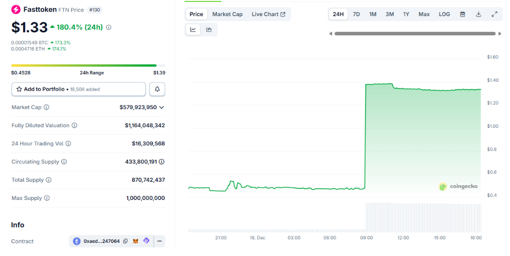 An einem Tag, der von anhaltender Schwäche im Altcoin-Sektor geprägt war, erwies sich Fasttoken (FTN) am 18. Dezember als der Star-Performer. Der aus dem Fastex-Ökosystem stammende Token erlebte eine kometenhafte Rallye und sprang in weniger als 24 Stunden von etwa 0,37 $ auf über 1,30 $, was einem Wachstum von fast 200 % entspricht.